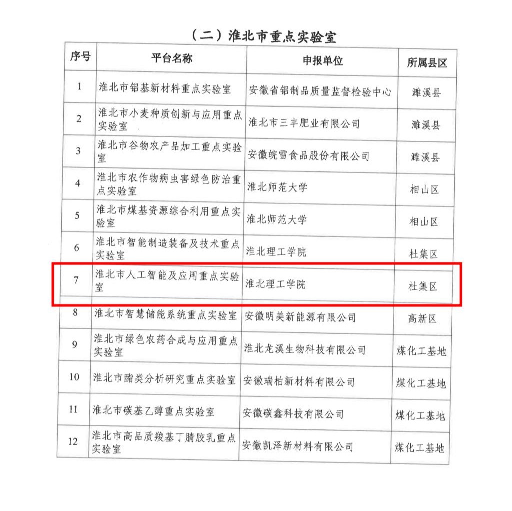 为进一步贯彻落实《关于加快推进科技创新平台建设的实施意见》(淮政办〔2023〕16号)精神,根据《关于印发<淮北市科技创新平台认定管理办法(试行)>和<淮北市科技创新平台绩效评价管理办法(试行)>的通知》(淮科〔2023〕16号)和《关于申报2024年度淮北市科技创新平台的通知》(淮科秘〔2024〕28号)文件精神,淮北市科技局经通知发布、组织申报、县区(园区)科技管理部门审核推荐、复核、专家评审、局党组会议研究同意、公示等程序,beat365在线唯一官网登录beat365在线唯一官网登录申报的“淮北市人工智能及应用重点实验室”,获批立项建设。