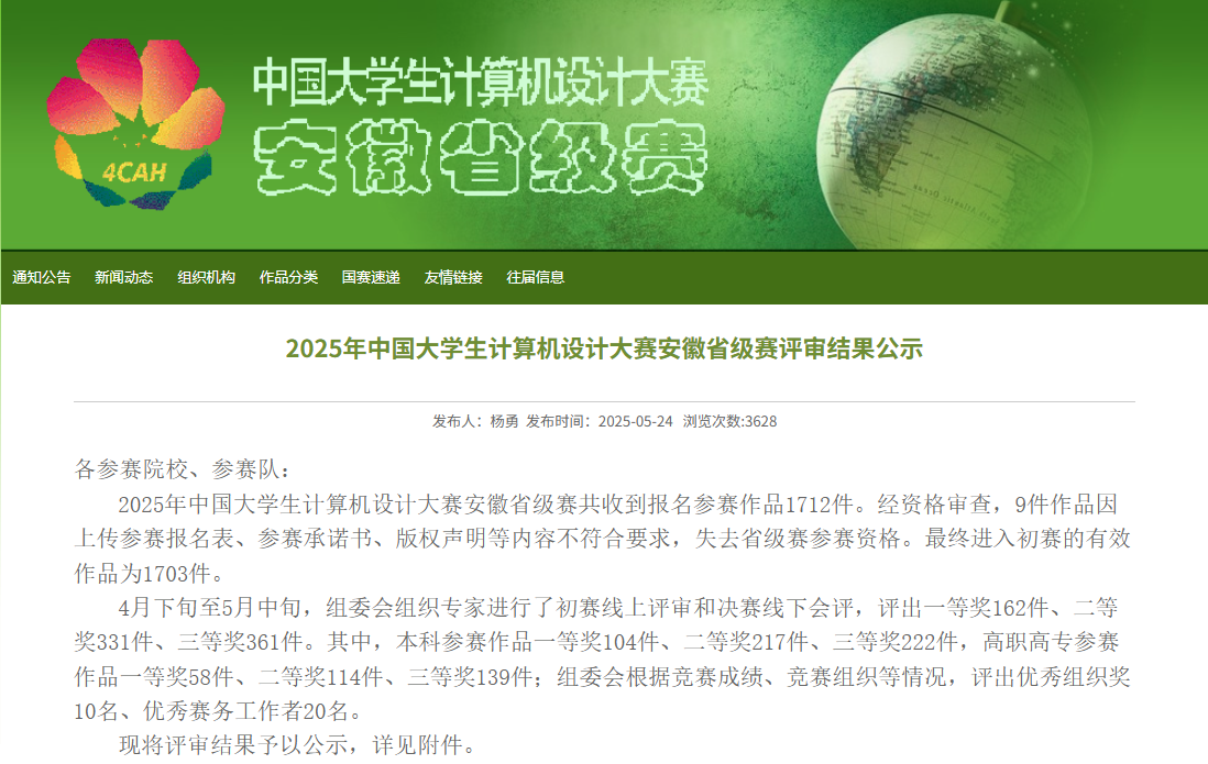 beat365beat365在线唯一官网登录学子在2025年中国大学生计算机设计大赛安徽省级赛中表现亮眼,凭借扎实的专业功底与创新实践能力,斩获多项荣誉。本次大赛中,我院学生共获得一等奖3项、二等奖3项、三等奖1项。取得了获一等奖数在全省参赛的43所本科高校并列第9名好成绩。其中4项作品被推荐参加在7月和8月份举行的全国总决赛。