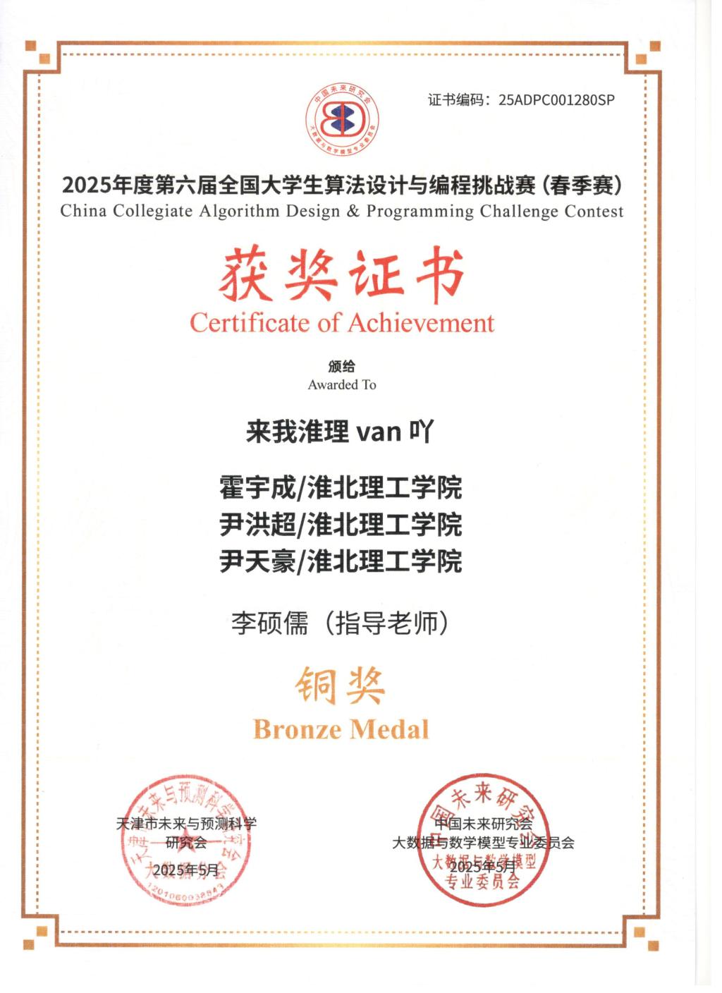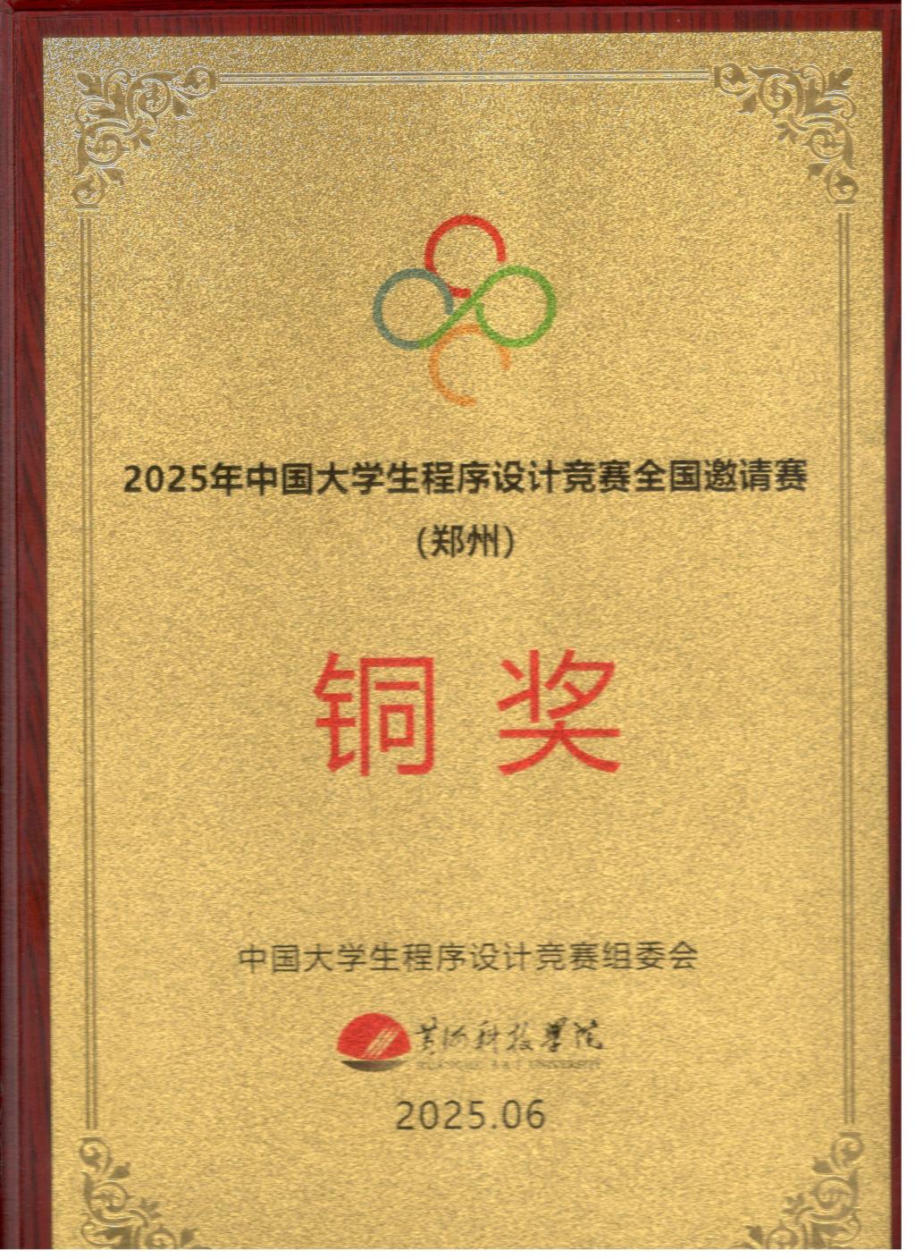以赛促学强能力,算法竞技展锋芒。beat365beat365在线唯一官网登录学子凭借扎实专业功底,获2025年度第六届全国大学生算法设计与编程挑战赛(春季赛)全国铜奖、获2025年安徽省机器人大赛——程序设计赛道省级二等奖、获2025年中国大学生程序设计竞赛全国邀请赛(郑州)全国铜奖。