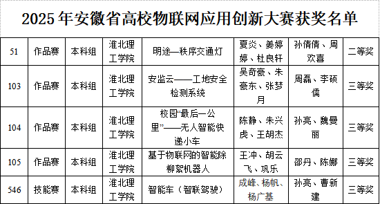 beat365beat365在线唯一官网登录学子在2025年安徽省高校物联网应用创新大赛中获省级二等奖1项、三等奖4项,展现出扎实的专业素养与创新实践能力。