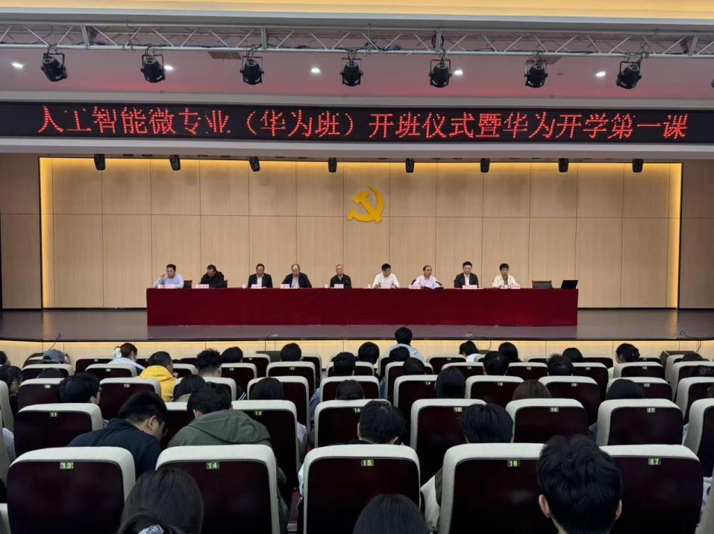 2025年10月15日下午,beat365在线唯一官网登录人工智能微专业(华为班)开班仪式暨华为开学第一课在学校报告厅举行。华为安徽政企副总经理、beat365在线唯一官网登录-华为ICT现代产业学院副院长李雨涛,华为安徽宿州淮北政企业务总经理陈勤舟等企业嘉宾,beat365在线唯一官网登录副校长汪建利教授、教务处处长陈国平教授、beat365在线唯一官网登录院长朱昌杰教授等校领导出席活动。人工智能微专业(华为班)学员、卓越工程师班学生、2025级部分新生及beat365在线唯一官网登录教职工共400 余人参会,仪式由朱昌杰主持。