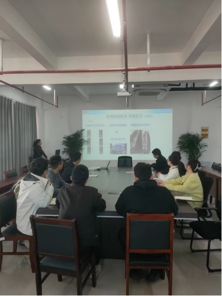 会议第二项,沈元元同志讲《信号与系统》课程思政课。内容为第2章第一节奇异信号中阶跃信号和冲激信号。该课程通过案例分析法、多角度阐述问题的方法来展开教学:通过类比生活中的开关问题讲解阶跃信号,引导学生思考,学会在遇到突变情况时,应如何冷静应对,迅速做出调整;通过列举生活中的物理现象来使学生理解比较复杂的抽象理论知识,感受科学魅力,激发学生的科研兴趣;通过多角度介绍冲激信号的定义,培养同学们要学会多角度思考问题的能力,拓宽学生的思维广度。沈老师将多个思政要素巧妙地渗透于课程教学中,实现了思政课与专业课的无缝衔接与有机融合。